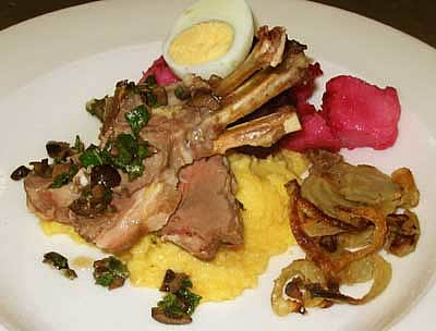 When ready to serve, gently toss the beetroot, potato and eggs together using a little of the beetroot juices as a garnish with some chopped flat-leaf parsley. Season to taste and put in a low oven for five minutes to warm. For salsa (can be prepared in advance): For the lamb: Place the racks in an oiled baking container, spread the garlic and thyme over and dob butter over the racks to keep moist while cooking. Bake in a pre-heated Mark 5 oven for 20 or 30 minutes (depending on whether you want rare or medium cutlets). Rest in a warm place for at least ten minutes before serving. Just before serving, separate the cutlets using a sharp knife. For fennel: Trim the fennel bulbs and slice them. Sautee in ghee over medium heat until just tender (10 – 15 minutes). Season to taste. For polenta: To serve: place a large spoonful of creamy polenta in centre of plate and arrange four lamb cutlets on top. Sprinkle a tablespoon of salsa on top. To one side place a portion of the sautéed fennel and to the other a scoop of the warm potato and beetroot salad. (Serves six) |