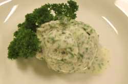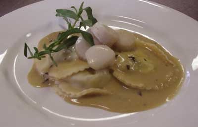 Sift the flour onto a clean surface and make a well in the middle. Pour in the eggs and oil. Add a pinch of sea salt. Gently work flour into the liquid to form a crumbly dough. Kneed until a smooth dough forms. Set aside. While the dough rests, in a small mixing bowl mix the ricotta cheese, pine nuts, spinach and chopped parsley and season with white pepper and sea salt to taste. Rolling the pasta: Forming the cappelletti: Scallops and sauce: Heat the fish stock to simmering point in a pan. In a separate heavy frying pan, melt ghee over medium heat. Sautee scallops for about 15 seconds per side. Raise heat to high and add vermouth and white wine. Bring to the boil and poach for thirty seconds or until the scallops are just cooked. Away from heat, scoop out scallops with a slotted spoon and keep in a warm place covered with plastic wrap. For the sauce: Add the hot fish stock to the wine and juices in the pan and boil over high heat to reduce by half. Add cream, return to the boil and reduce a little more until sauce is a good consistency. Season to taste and add chopped tarragon. To serve: Place four or five cappelletti in the centre of each plate, top with four of the scallops and spoon a little of the sauce over. Garnish with a sprig of tarragon. (Serves six) |