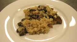 While this dish is relatively simple it pays to do it properly, so by careful preparation of the squab we made our own game stock. We skinned the squab (discarding the skin) and carefully removed the two fillets and reserved them for separate cooking later. We sliced off the legs and roasted them for 15 minutes with a little oil in a medium oven and, when cooled sufficiently, we separated the meat from them and put the bones into the stock pot with the skeleton, neck, giblets and wings of the squab plus 1.5 litres of water, a chopped carrot, a peeled onion, two peeled cloves of garlic, some celery tops, a couple of cardamom pods, a bay leaf, a few whole black peppercorns, three teaspoons of sea salt, a single clove, a sprig of thyme and two cups of good chardonnay. This was brought to the boil and simmered for a couple of hours, strained and the solids discarded. For the risotto: Take a large pan and melt the ghee or clarified butter. Cook chopped onions over a medium heat without colouring until they are soft and golden; add the rice and stir to coat well. Turn the heat up and add a ladle of the hot stock and cook, stirring, until the rice absorbs it. Add another ladle of hot stock and repeat the process. Do this until the rice is almost to the required al dente stage and has absorbed enough fluid (this is a matter of taste. Chef likes risotto to be milky and nutty but not runny. See the picture). Add chopped Swiss Browns and porccini mushrooms and the reserved flesh of the roasted squab and cook a further minute or so. Check seasoning. Set aside in a warm place. Working fast, in a pan with a little oil or butter, sautee the shitake mushrooms for a few minutes. In another pan with clarified butter, sautee the reserved squab breasts for about one and a half minutes each side until cooked to rare. Remove from the pan and slice these thickly. To serve: Spoon rissoto onto plates, top with squab breast slices and garnish with shitake mushrooms and shaved parmesan cheese. |